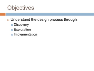 The document outlines the key stages of the web design process: discovery, exploration, and implementation. In the discovery stage, the designer meets with clients to understand their business, goals for the website, target audience, and competitors. Next, in the exploration stage, the designer analyzes the information to create an information architecture and organize content. Finally, in the implementation stage, the designer creates layouts, designs the interface with colors and styles, and selects a final design.