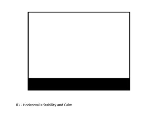 1. The document discusses principles of visual composition including how horizontal and vertical lines convey calmness and activity, diagonals imply motion, and the upper half of the picture plane suggests freedom while the lower half feels grounded.