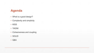 The document discusses essential design principles for software development, emphasizing the importance of simplicity, maintaining low coupling and high cohesion, and adhering to the SOLID principles. Key concepts include the KISS principle, the YAGNI philosophy, and the significance of code reviews. It highlights that good design minimizes the cost of changes, avoids unnecessary complexity, and focuses on creating cohesive, single-responsibility classes.