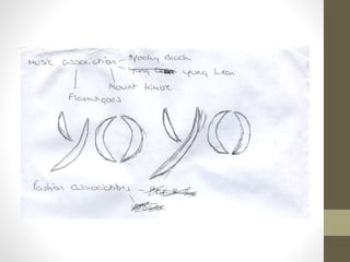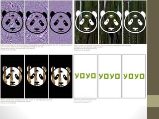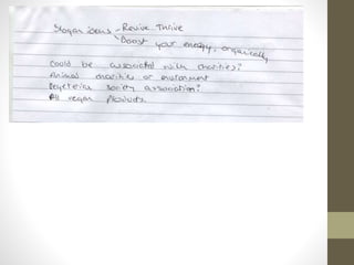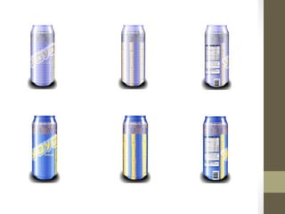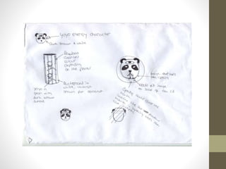 This document summarizes the development of an advertisement design for an energy drink. The designer experimented with different font styles and colors before selecting a bold green font with a Japanese influence. Packaging designs were created for different drink flavors using complementary color schemes. An initial magazine advertisement featured a large panda logo with the brand name in Japanese and English. Through iterations, the designer improved readability by reducing the background opacity and enhancing the can design details. The final advertisement prominently features the refined can design alongside the repeating panda pattern and brand name.