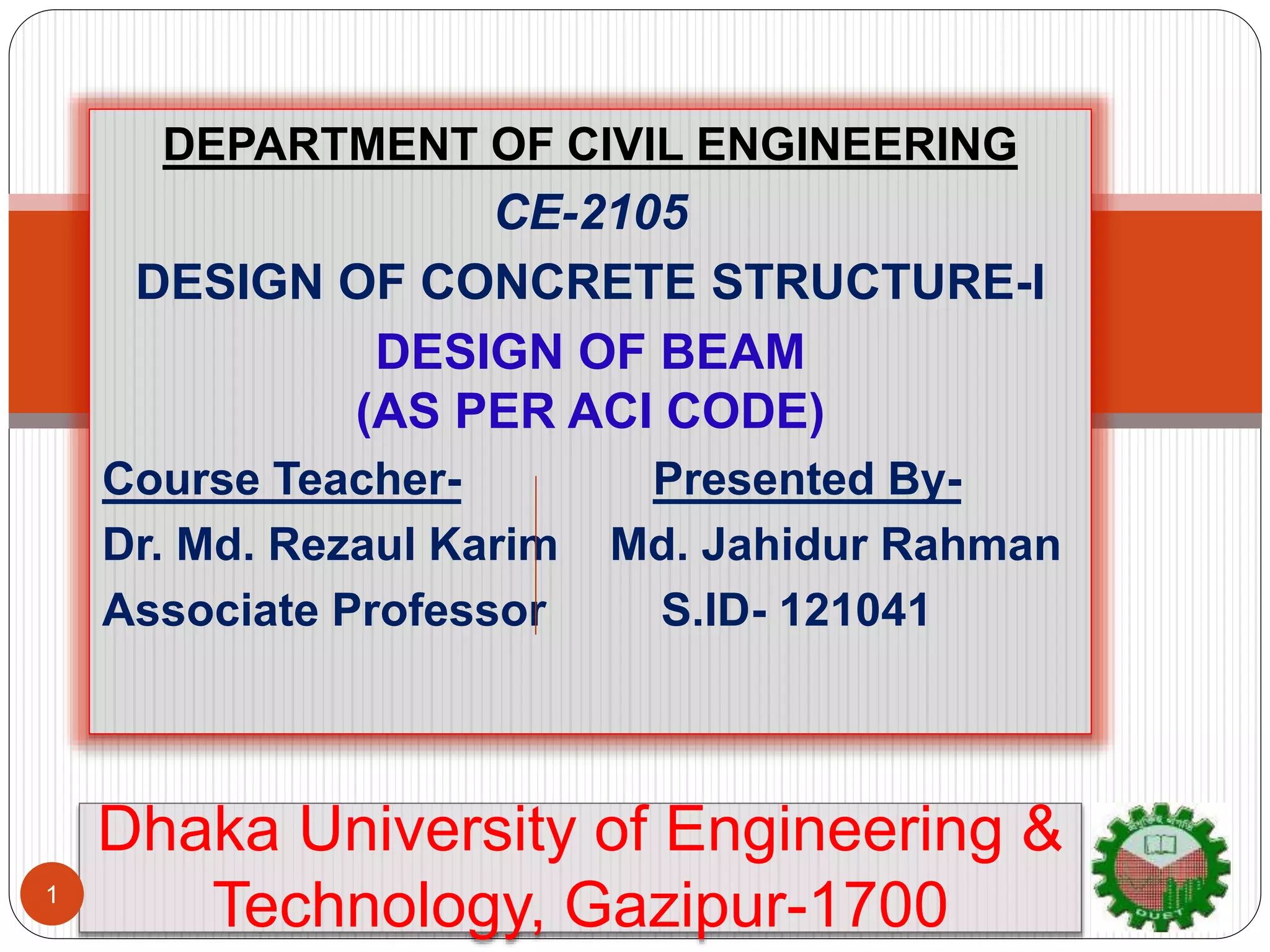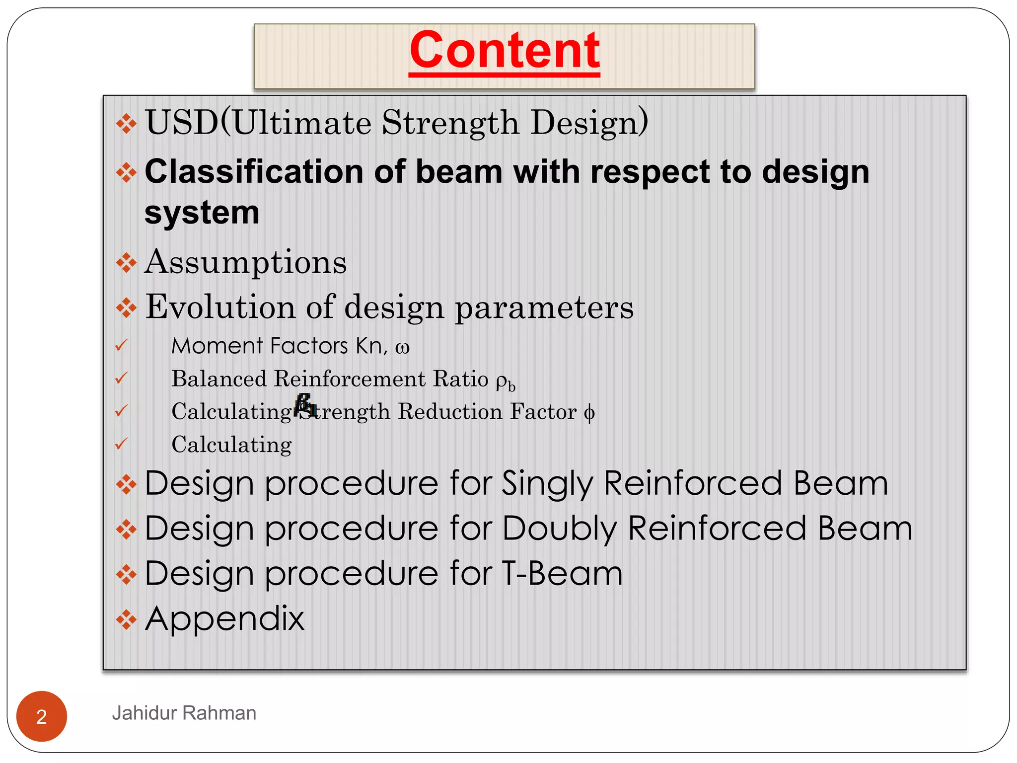 The document discusses the design of concrete beams according to ACI codes, focusing on ultimate strength design (USD) principles, and classification of beam types. It outlines assumptions, design parameters evaluation, and detailed procedures for singly reinforced, doubly reinforced, and T-beams along with minimum reinforcement requirements. Additionally, it provides practical guidelines and rules of thumb for effective design and reinforcement placement.