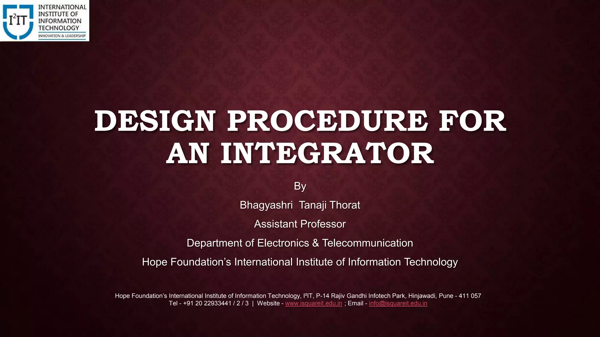 The document describes the design procedure for an integrator circuit. The procedure involves: