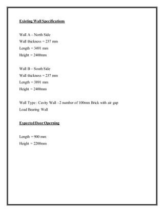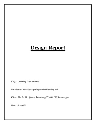 The design report details modifications to a load-bearing wall, specifically the addition of new door openings for client Dhr. M. Hooijmans. It includes specifications for existing walls, expected loads, and structural calculations for beam design, confirming that an HE160A beam is suitable for the project. The report provides comprehensive calculations for loading, bending moments, and shear forces, ensuring compliance with safety factors and deflection criteria.