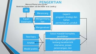 2. Metode design research melibatkan tahap persiapan, desain awal, dan analisis retrospektif untuk mengembangkan teori instruksi lokal.