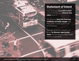 This document summarizes research conducted by students at California College of the Arts for the Mayor's Office of Innovation in San Francisco regarding public transit use in the city. Through surveys and interviews, the researchers sought to understand how residents use public transit and what they value about the system. They identified issues such as a lack of communication from employees, overcrowding, and unreliable service. The document outlines stories of three hypothetical transit users and discusses opportunities to improve the user experience, such as expanding employee roles, improving comfort, and incentivizing community involvement.