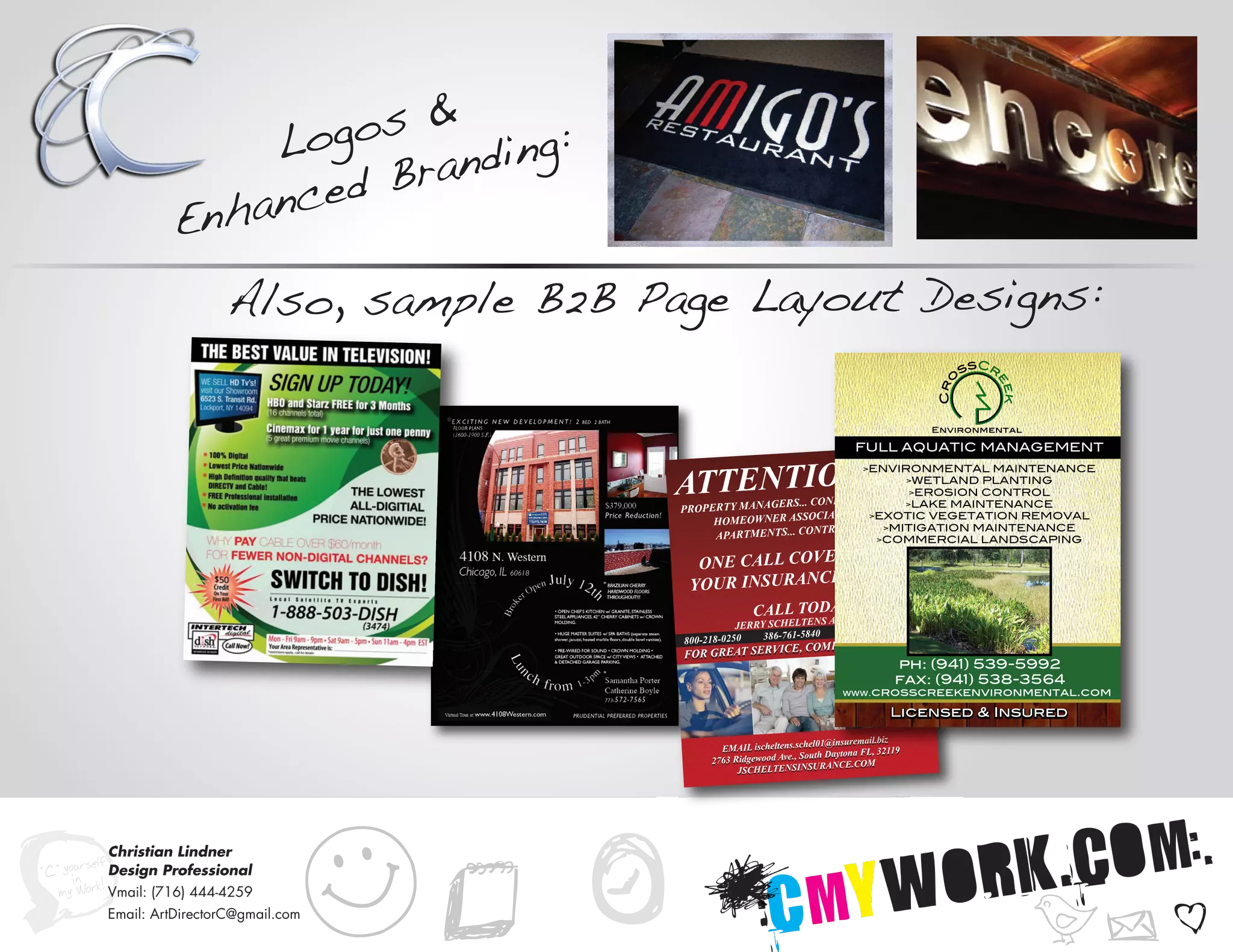 The document outlines services related to environmental maintenance, including wetland planting, erosion control, lake maintenance, and exotic vegetation removal. It advertises a company offering these services alongside contact information and encourages potential clients to reach out for competitive rates and comprehensive coverage. Additionally, it includes references to design professionals linked to branding and layout for a B2B page.