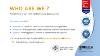 Neuronimbus is a 17-year-old full-service digital agency that provides end-to-end digital solutions including web and app development, digital marketing, UI/UX design, and more. They have a dedicated team of digital experts across India and Australia. Some of their clients include PwC, Panasonic, and Whirlpool. Their services are focused on innovation, simplicity, and quality. They follow a process tailored for success from digital strategy to delivering unique user experiences.