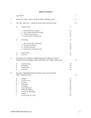 This document provides an overview of the process of structural steel design and construction from engineering through erection. It begins with an introduction to steel as a building material, highlighting its advantages over other materials. It then outlines the typical steps in the steel process, including engineering, detailing, fabrication, and erection. Key aspects like main member design, connection design, shop drawings, and erection are discussed. Special considerations like weight, connections, quality, and schedule impacts are also covered. The document aims to give attorneys a framework for understanding structural steel projects and potential issues that can arise.