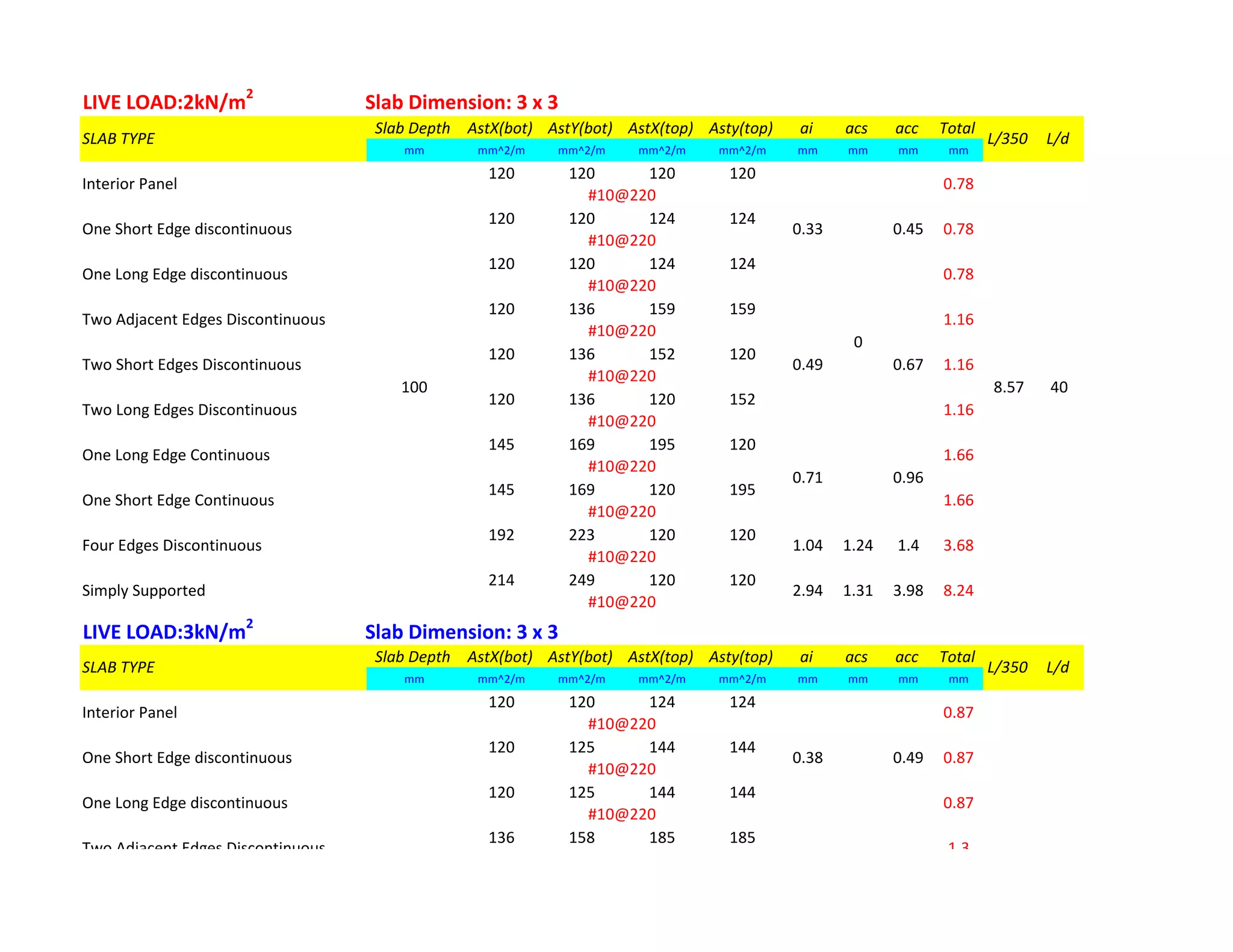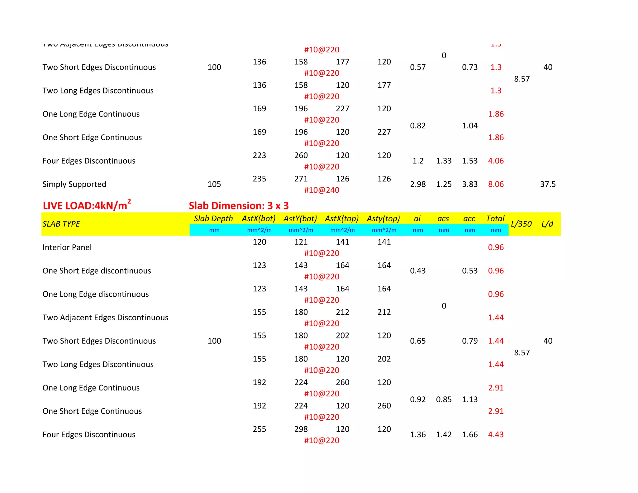 This document provides reinforcement details for concrete slabs of varying dimensions and live loads. It includes slab depth, area of bottom and top steel reinforcement, and design parameters like limit state ratios. Reinforcement amounts generally increase with higher live loads and larger slab dimensions and depths. Design is governed by factors such as simply supported versus continuous edges, and interior versus edge panels.