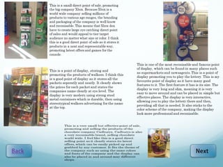 This document provides an analysis of several direct points of sale displays and brands. It evaluates displays for Tony Ferguson, Hovis, and Walls based on attractiveness, visibility of information, and organization. It also profiles customer targets and advertising approaches for brands like Lynx, Old Spice, and Fish Soho. Finally, it assesses factors like price, popularity, and environment placement for various competitor brands.