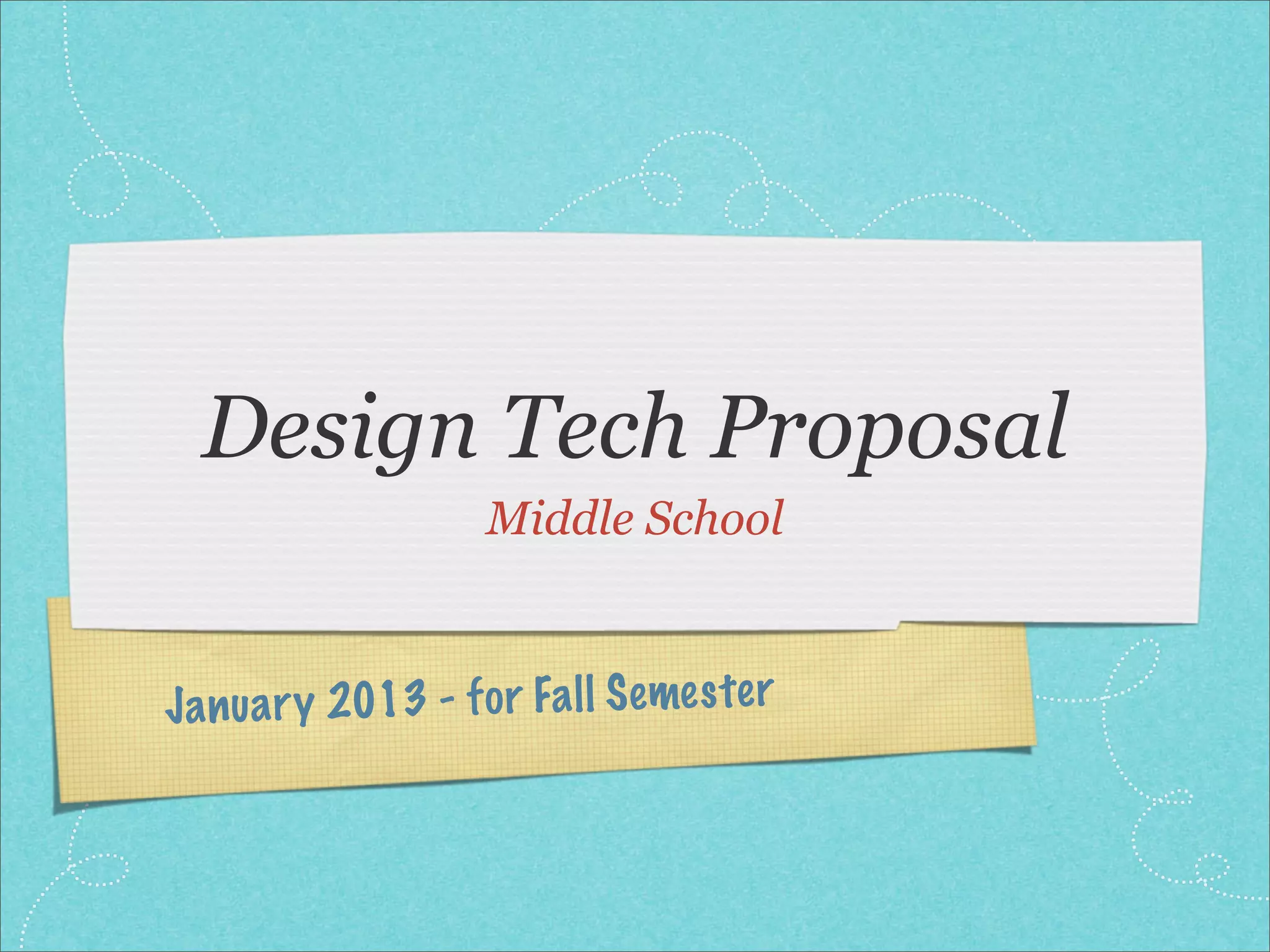 This document proposes a design technology program for middle school students that would include courses on power and machines, robotics, programming, design and build, and electronics over multiple grades and semesters. It would include required courses as well as electives and co-curricular activities. Students would study simple machines and power sources in 6th grade courses that could last one semester or a full year. Robotics courses would focus on Lego robotics design and control, while programming courses would emphasize structure and routines. Design and build courses would utilize CAD and different materials and tools. Electronics courses would cover basic circuits and components.