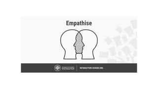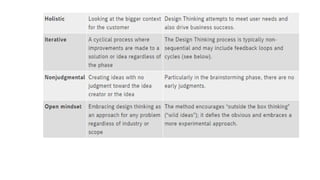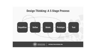 Design thinking is a creative problem-solving process that involves empathizing with users, defining problems from a human-centered perspective, generating creative ideas, building prototypes, and rigorously testing solutions. It is an iterative process comprised of five stages - empathize, define, ideate, prototype, and test - that allow designers to gain an understanding of users and their needs in order to design effective solutions. The stages do not always occur sequentially and can be repeated as understanding improves. Overall, design thinking provides a systematic approach to innovation focused on the needs of users.