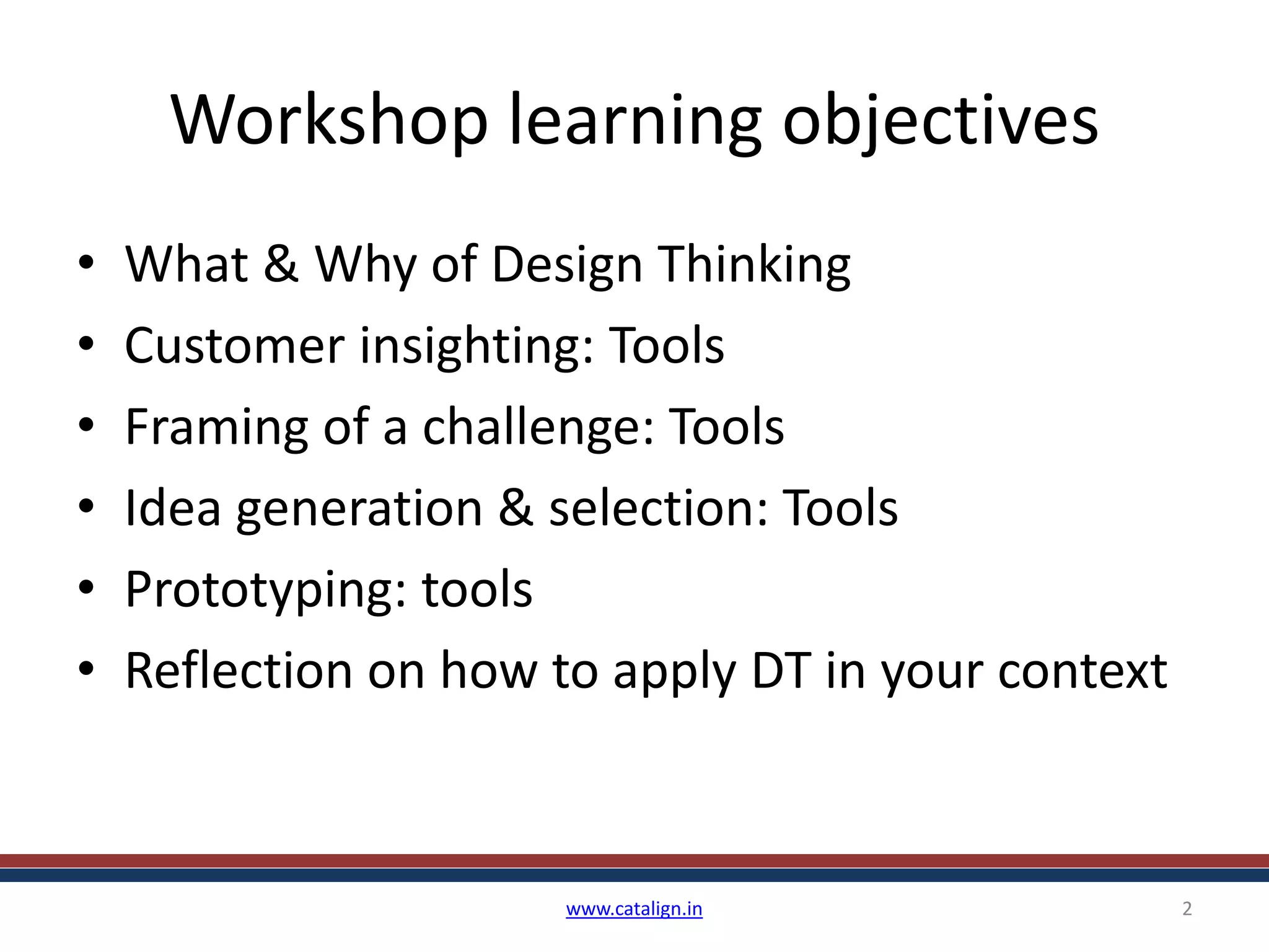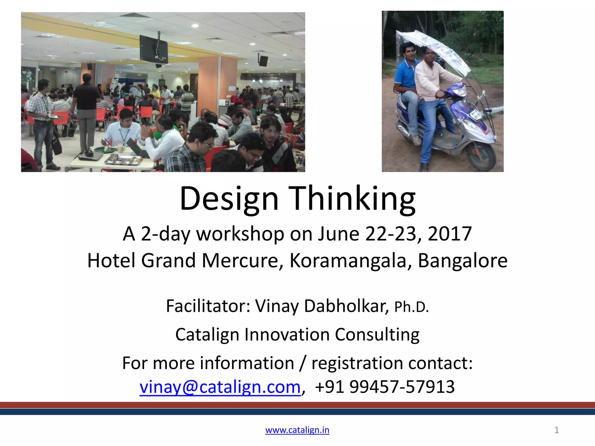 The document outlines a 2-day workshop on design thinking facilitated by Vinay Dabholkar in Bangalore on November 3-4, 2017. The workshop aims to teach participants about design thinking principles, customer insight tools, idea generation, prototyping, and how to integrate design thinking into their organizations. It includes a detailed agenda with field research, data synthesis, and hands-on prototyping exercises.