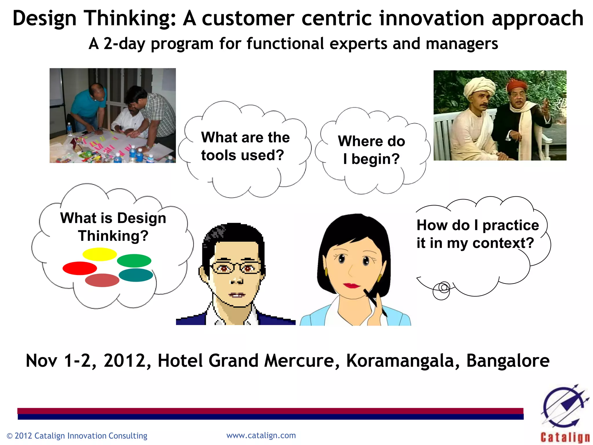 The document outlines a two-day workshop on design thinking scheduled for November 7-8, 2012, at Hotel Grand Mercure, Bangalore, aimed at professionals with 5 to 15 years of experience. Participants will engage in immersive experiences to identify customer challenges and develop innovative solutions through a hands-on approach, covering topics like prototyping and validation. The fee for the workshop is Rs 15,000, which includes refreshments and lunch but excludes travel and service tax.