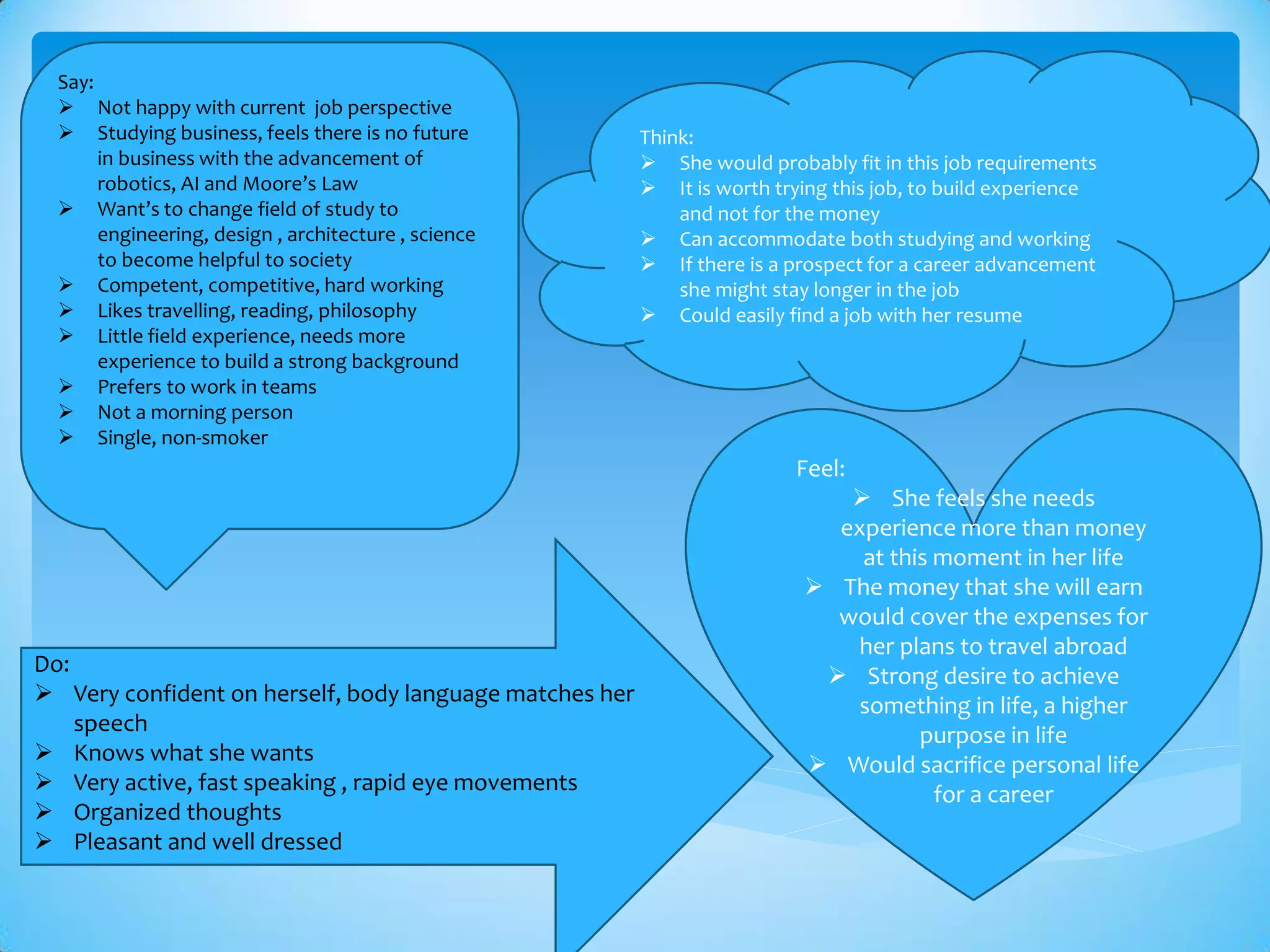 Roxanne is unhappy with her current job prospects in business due to advances in technology. She wants to change fields to engineering, science, or architecture to be more helpful to society. She is competent, hard-working, and prefers teamwork. Roxanne needs more work experience and hands-on learning to build her background while still in school.