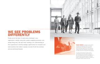 The document discusses Booz Allen's design thinking methodology which takes a human-centered approach to understanding problems by studying people's experiences and identifying their unmet needs. It provides examples of projects where Booz Allen used this approach to develop solutions such as tools to help military sexual assault survivors, platforms to help veterans transition to civilian careers, and services to support people's health goals. The design thinking process involves immersing in the user experience, generating insights from collected data, exploring solutions, and testing ideas through low-fidelity prototypes.