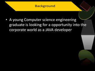 The document discusses methods for improving English communication skills for a computer science graduate seeking job opportunities. The most practical method is to give commentary while watching performances, as it provides practice speaking without translation. The most disruptive method is migrating to an English-speaking country to be fully immersed in the language. The favorite method is participating in theaters, as it builds confidence through practice and allows self-reflection on speaking skills.