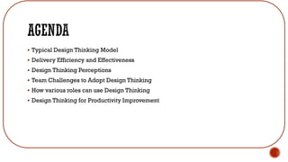 The presentation discusses how design thinking can improve delivery effectiveness and efficiency. It outlines the typical design thinking model and how various roles can use it. It also discusses perceptions of design thinking and challenges teams face in adopting it. The document provides details on how design thinking focuses on the user, business value, market relevance, and improvement opportunities. It provides guidance on identifying user personas, understanding needs, ideating solutions, and validating ideas through quick prototypes and user testing.