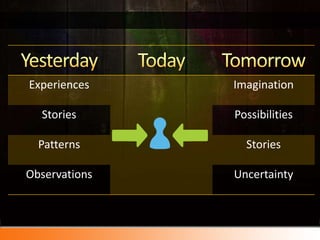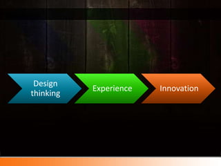 Design thinking is a creative process that combines analytical and creative thinking to solve problems. It involves building ideas through experimentation and quick prototyping to get early feedback. Innovation is a byproduct of design thinking and involves being comfortable with uncertainty, believing the best solutions are yet to be found, and a willingness to fail early and often. Good design thinkers have an observing eye, question things beyond the obvious, and are willing to experiment. Design thinking is about understanding people through positive emotional experiences rather than just focusing on products.