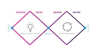 Design thinking focuses on listening, empathy, and sense-making to develop context-sensitive and humanized solutions. It uses qualitative and quantitative research methods like kitchen stories to generate actionable insights. Participants work together in co-creative ideation and rapid, cheap prototyping like wireframes, storyboards, fake ads, role playing and Legos to learn and not just build. The goal is to act as catalysts for solutions rather than experts knowing best.