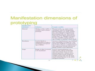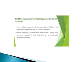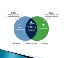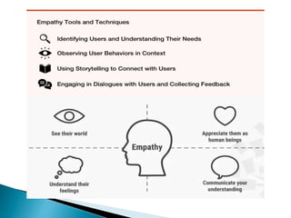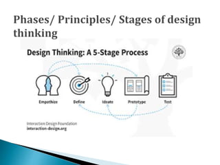 Design thinking is a human-centered approach to problem solving that involves understanding user needs through methods like empathy and observation. It defines problems from the user's perspective then generates creative solutions. Key aspects include empathizing with users through interviews and observation to define problems, ideating multiple solutions, and prototyping and testing ideas with users in an iterative process. This document outlines the design thinking process and common methods used at each stage to develop solutions that meet user needs.