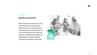 Данный документ представляет собой руководство по процессу дизайн-мышления, направленного на создание человеко-ориентированных продуктов и услуг, состоящее из шести этапов: эмпатия, фокусировка, генерация идей, выбор идеи, прототипирование и тестирование. Основное внимание уделяется пониманию потребностей пользователей через эмпатию и синтезирование информации для решения проблем. Каждая стадия разработана для обеспечения инновационных решений посредством активного вовлечения пользователей и создания прототипов.