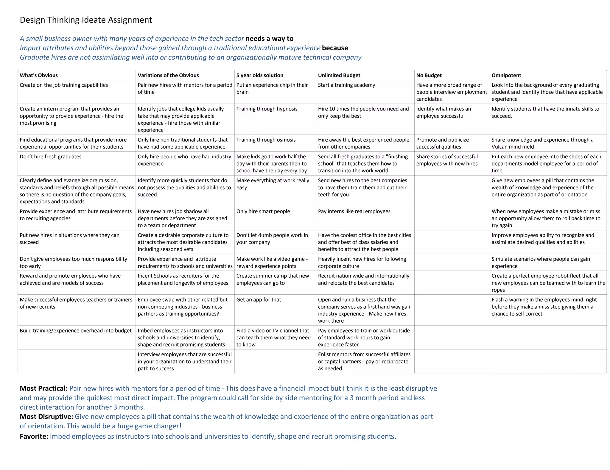 The small business owner needs to impart additional skills and experience to new graduate hires, as they are not assimilating well. Suggestions include pairing new hires with mentors for a period of time to provide on-the-job training, and creating an intern program to give students experience before hiring. Another option is to embed employees as instructors in universities to help identify and recruit promising students who will be better prepared for the workplace.