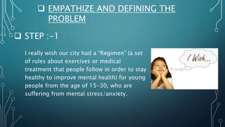 The document discusses the increasing mental stress among youth and proposes solutions. It begins by outlining the problem - rising rates of mental stress, anxiety, and suicide among 15-30 year olds. Next, it discusses potential causes like unemployment and presents insights from research interviews with youth. Several solution ideas are then proposed, including an "Appli Mentally" app that allows anonymous meetings between users to share experiences. It would include features like tracking mental health over time, exercise guides, and donations. The document concludes by noting the solution was not tested but feedback suggests it could effectively address the challenge of mental stress.
