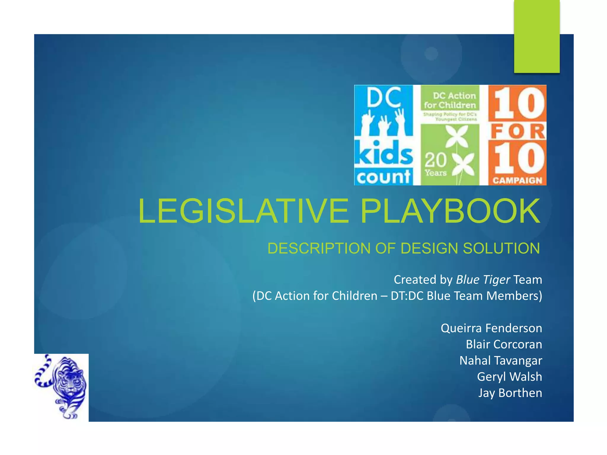 The document describes a design solution created by a team for DC Action for Children to help connect people serving at-risk children to necessary data. Through interviews, the team identified that the organization needs to provide data in a way that creates awareness and drives utilization. They created a prototype called the Legislative Playbook, a responsive website allowing council members to use children's advocacy organization data and constituent feedback to make informed policy decisions benefitting children.