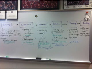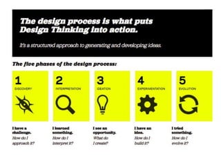 The document provides an overview of the design thinking process and outlines exercises for educators to work through each stage of design thinking with their students. It breaks down the process into key stages - discovery, interpretation, ideation, iteration, and evolution. For each stage, it describes the goals and tasks involved and provides rubrics to assess student work at emerging, developing, proficient, and accomplished levels. The overall purpose is to help educators learn and apply design thinking approaches in their classrooms.