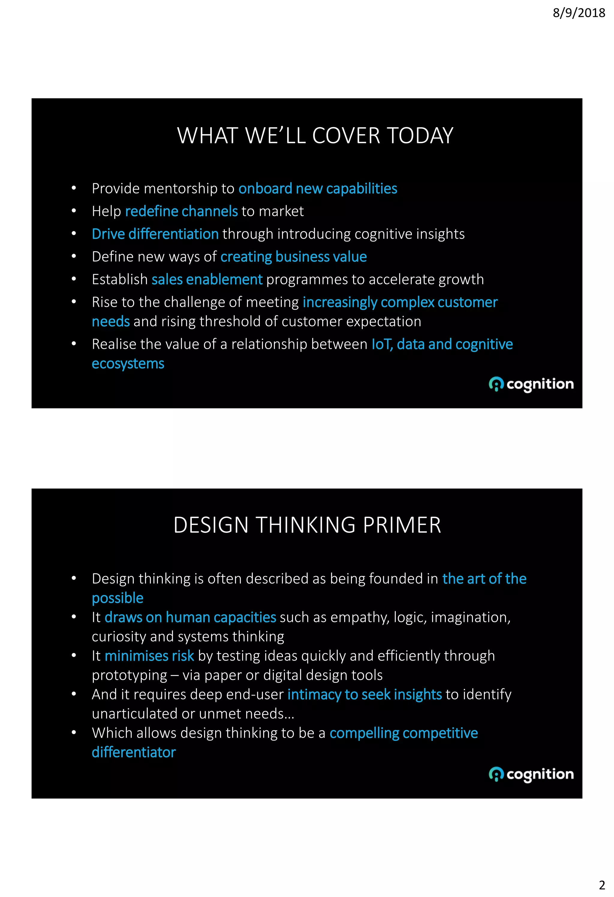 The document outlines a design thinking framework aimed at decision makers, emphasizing its role in fostering innovation and addressing complex customer needs. Key topics include mentorship, business value creation, and the integration of cognitive insights and IoT data. The document also highlights lessons learned about the importance of risk-taking, customer focus, and stakeholder engagement in successful design thinking initiatives.