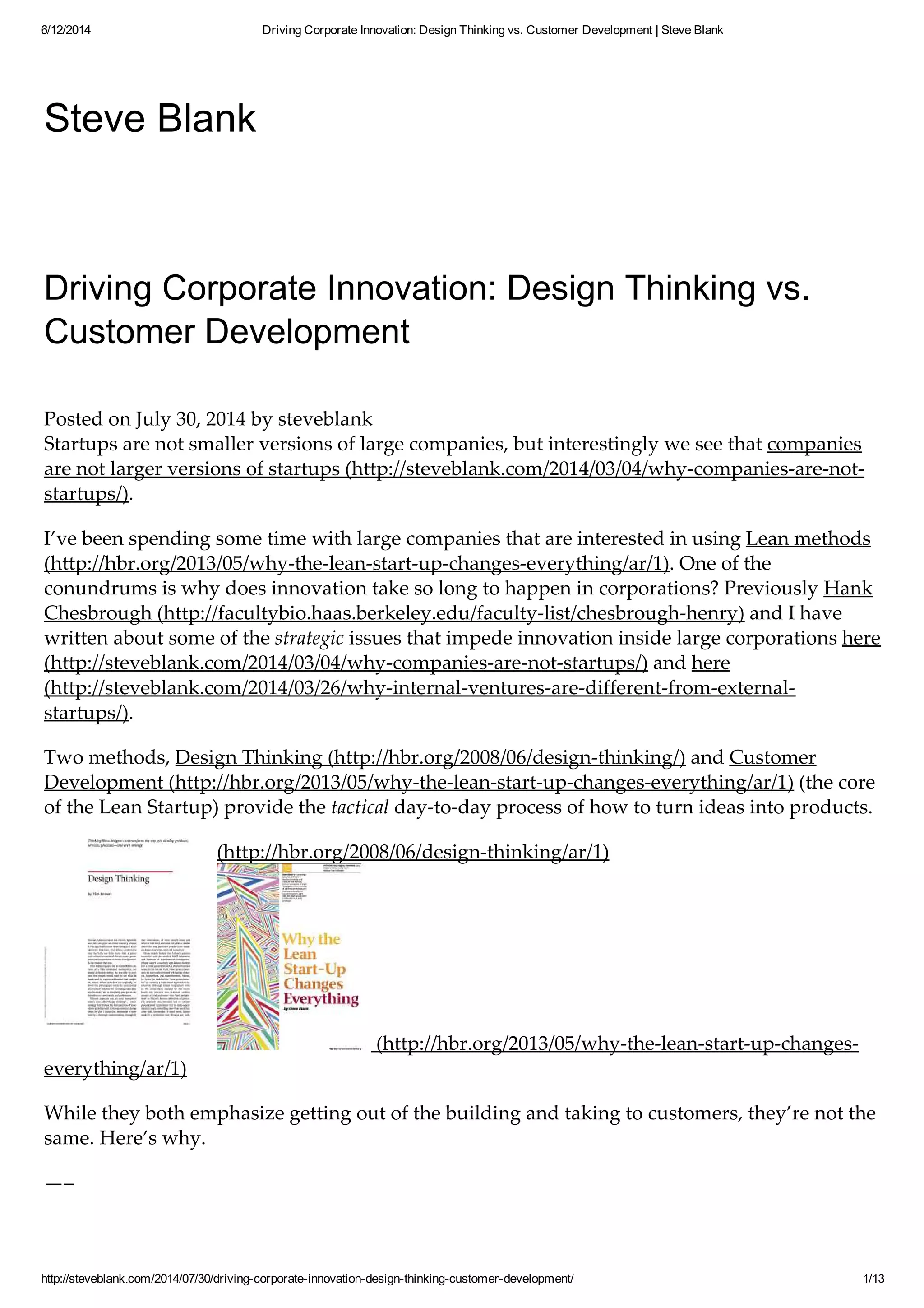 Comparison between Design Thinking and Customer Development, made by Steve Blank