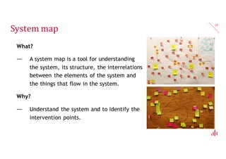 The document outlines the principles of systems thinking and its application in the design process, highlighting the importance of viewing problems holistically rather than through a linear cause-effect lens. It discusses tools such as system maps, causal loops, and archetypes to analyze complex issues like childhood obesity, encouraging collaborative and comprehensive approaches to problem-solving. The goal is to create effective design interventions that address interconnected challenges by understanding and mapping the intricate relations within systems.