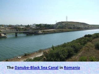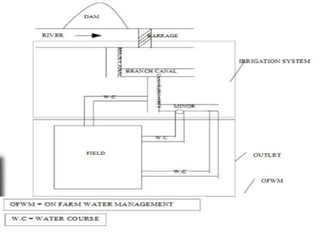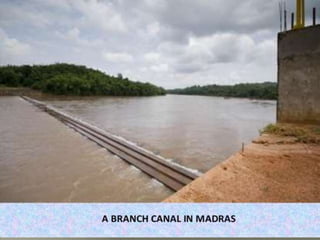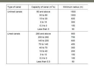 Canal design involves defining types of canals based on use and discharge. There are two main types - aqueducts for water supply and navigable waterways. Canals are also classified based on discharge into main, branch, major/minor distributaries and watercourses. Design considers canal shape, lining requirements, and layout to minimize curves and balance cuts and fills. Proper drainage systems including surface ditches and subsurface pipes are also important to control water levels and allow cultivation. Explicit equations have been developed for least-cost design of common canal shapes like triangular, rectangular, trapezoidal and circular.