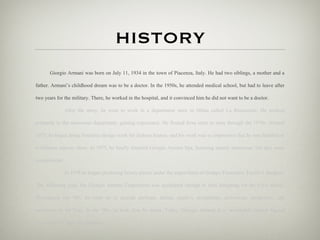 Giorgio Armani is an Italian fashion designer born in 1934. He founded his company, Giorgio Armani SpA, in 1975 known for clean, simple, elegant styles featuring neutral colors and high quality fabrics like linen and silk. Armani pioneered combining luxury and comfort in his clothing. He influences many other designers and his brand remains globally popular for its timeless yet modern aesthetic across multiple product lines from $50-25,000.