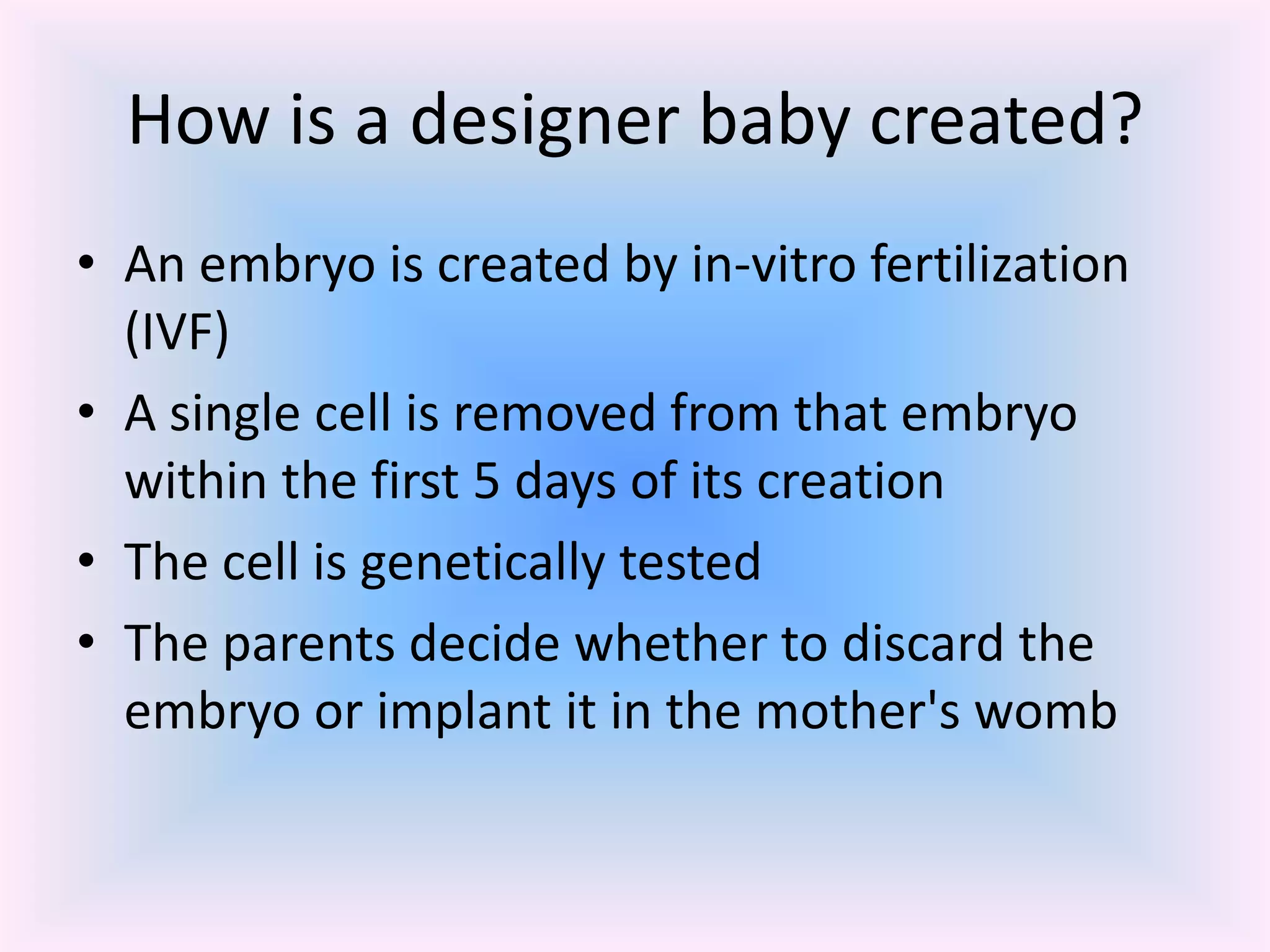 The document discusses designer babies and genetic engineering. It provides information on how designer babies are created through IVF and genetic testing of embryos. While there are some benefits like using genetic engineering to help a sick sibling, there are also many risks. These risks include mutations and diseases from gene alterations, taking away a child's autonomy, and leading to unfair advantages or discrimination. Overall, the conclusion is that the risks of creating a designer baby are greater than the potential benefits.