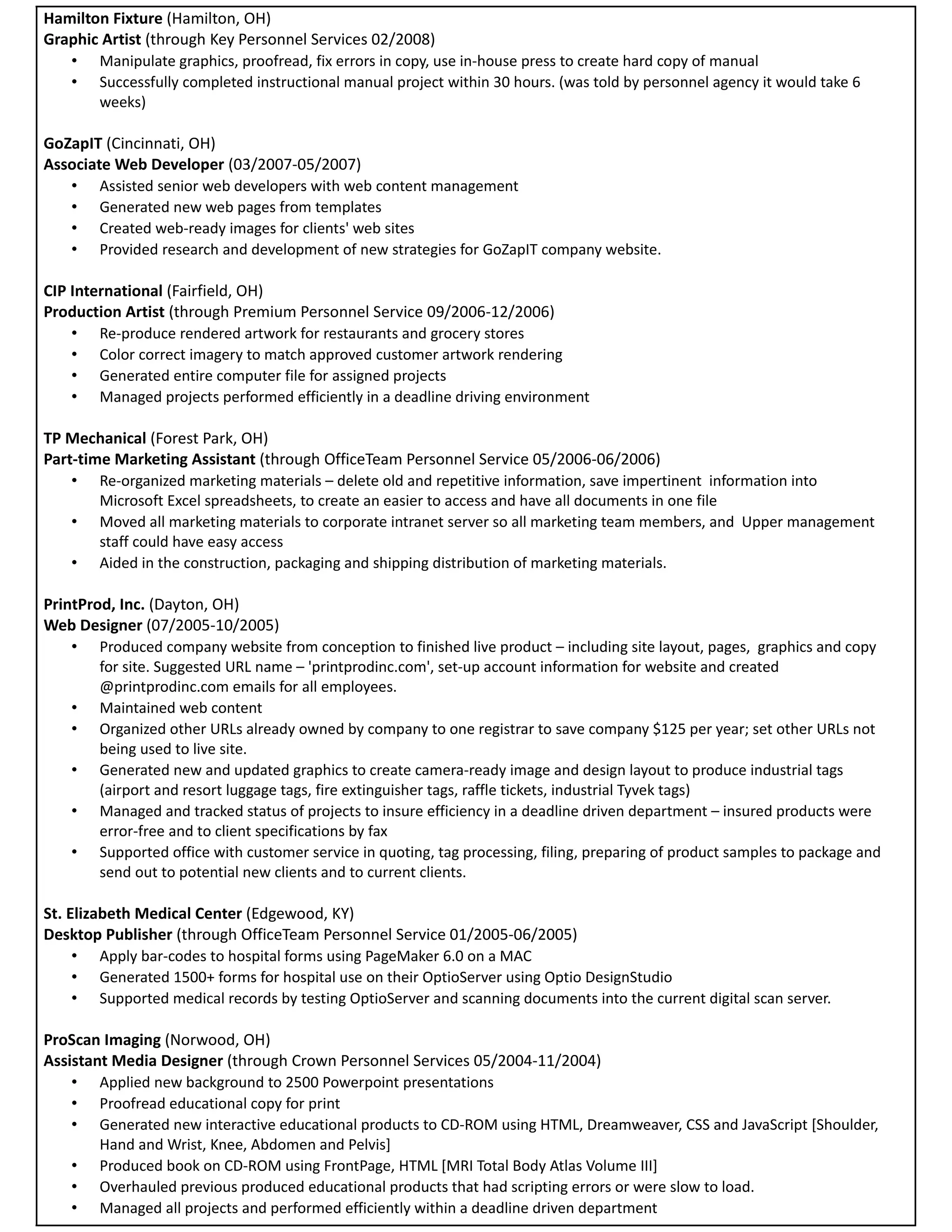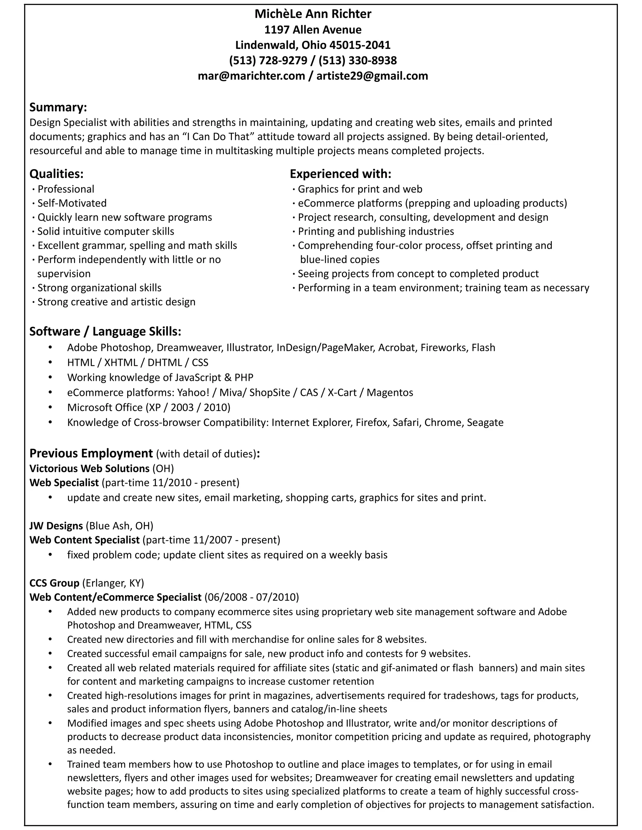 The document provides a summary of MichèLe Ann Richter's work experience and qualifications. It summarizes her as a design specialist with over 20 years of experience in graphic design, web design, and desktop publishing. She has extensive skills in programs like Photoshop, Dreamweaver, and Microsoft Office and has worked on projects for various companies, managing projects from concept to completion.