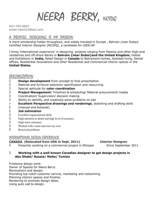 This document provides a profile for Neera Berry, an interior designer based in Canada with international experience. She holds certifications as an NCIDQ certified interior designer and is a candidate for LEED-AP. Her experience includes designing palaces, high-end residences, banks, hotels, exhibitions, retail spaces, dental offices, assisted living facilities, and residential renovations in locations like Bahrain, the UK, India, Canada, and the US. She provides services like design development, material selection, project management, and CAD work.
