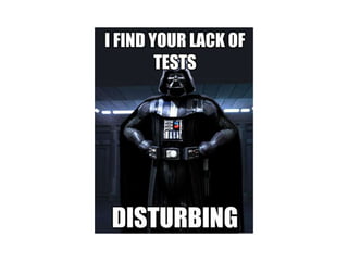 The document discusses design principles for testability, emphasizing high cohesion, low coupling, and good encapsulation. It outlines important design concepts such as single responsibility, open/closed, and dependency inversion principles, as well as best practices for unit testing with specific tools. Additionally, it highlights common pitfalls like global state and static methods that hinder testability, while advocating for practices like dependency injection and the use of polymorphism over conditionals.