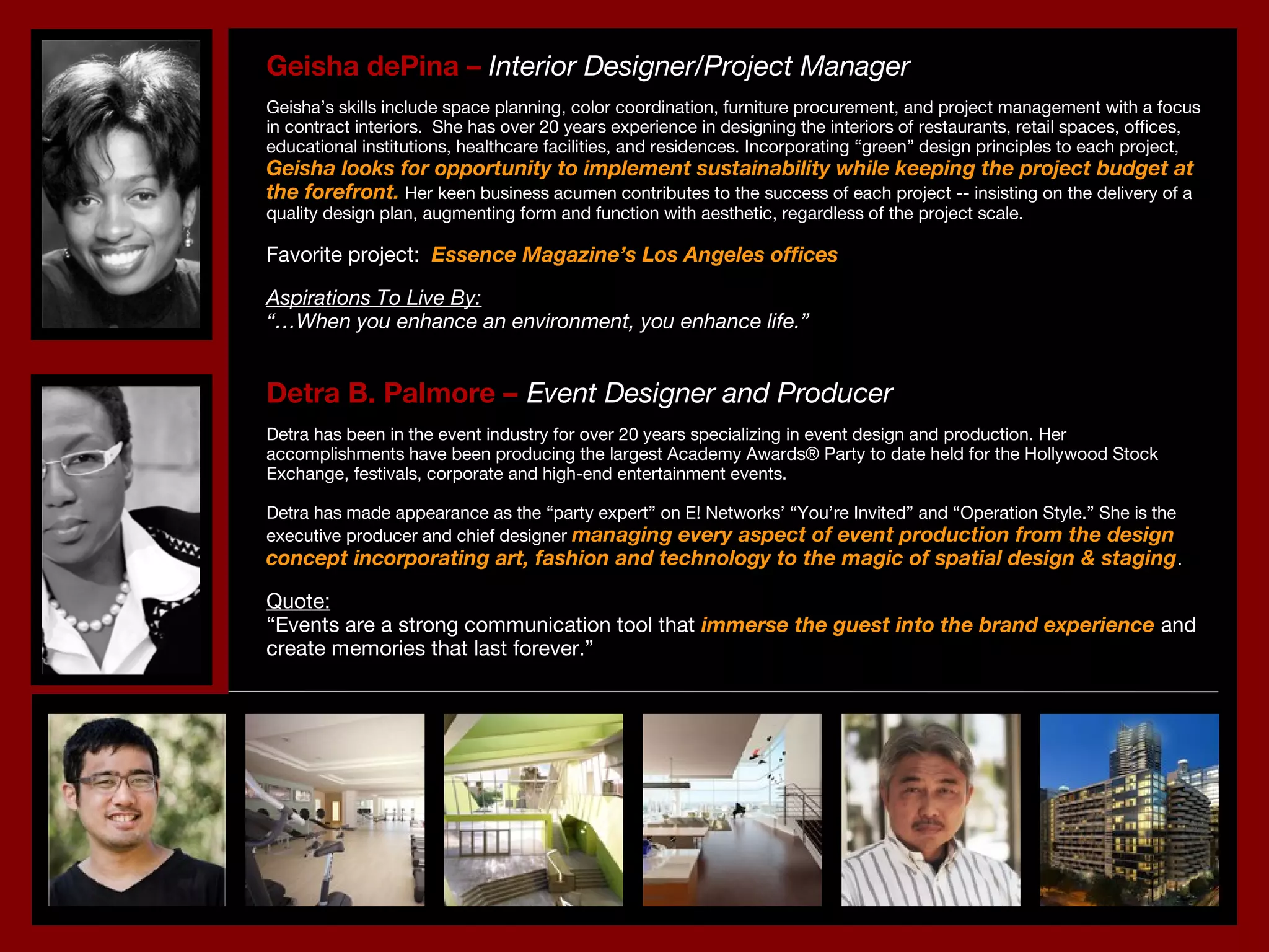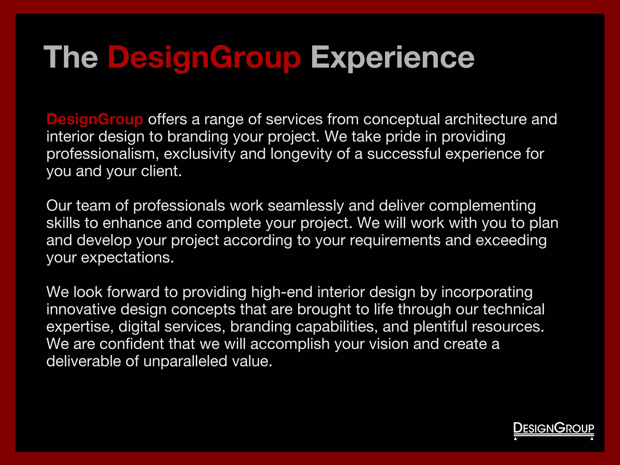 DesignGroup offers a range of interior design, architecture, and branding services to complete projects according to clients' requirements and exceeding their expectations. Their team of professionals seamlessly delivers complementary skills to enhance projects through innovative design concepts and technical expertise. DesignGroup is confident they can accomplish clients' visions and create deliverables of unparalleled value.
