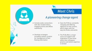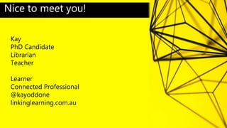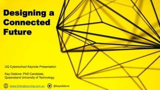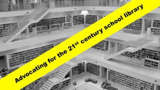 The document discusses designing a connected future for school libraries. It proposes taking a networked learning approach framed around principles of equity, participation and social connection. This involves cultivating connections between people, information and ideas. The library should act as a hub where passion-driven learning occurs through participation, interconnection, challenge and creation. A connected future is outlined as one that values, promotes and creates an environment of connectivity by connecting students, teachers and information.