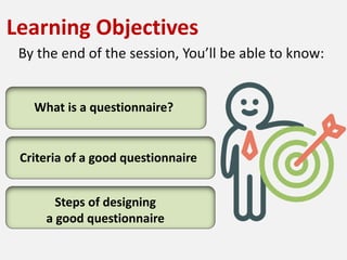 The document outlines the fundamentals of creating effective research questionnaires, emphasizing their purpose in gathering essential information for scientific studies. It details the criteria for a good questionnaire, including clarity, specificity, and focus, as well as steps for design, such as defining objectives, targeting respondents, and piloting the questions. References for further reading on the topic are also provided.
