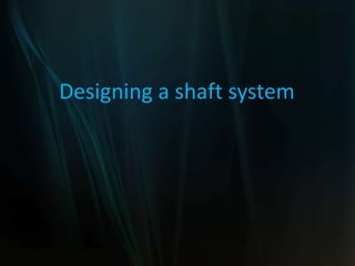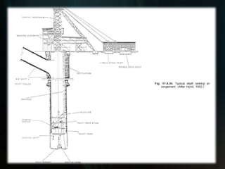 The document discusses key considerations for designing a shaft system for an underground mine. It addresses the interrelation of the shaft subsystem with other mine systems like ventilation, dewatering, and transport. The main elements of a shaft system include the headframe, winder house, shaft collar, fan drift, fittings and conveyances. Designing the shaft requires a multidisciplinary approach and consideration of functional requirements, geological conditions, operational parameters, and statutory regulations. Choice of the winding system, conveyance type, and winder location are important design decisions.
