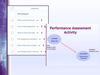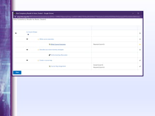 The document outlines a session led by Dr. Theresa Butori on developing competency structures and learning objectives for course developers. It emphasizes the importance of aligning graded assignments with learning objectives in Brightspace, assessing student progress, and using measurable, realistic tasks and rubrics. Key elements include creating course-level objectives and assessment tasks that provide evidence of students' skills and knowledge.