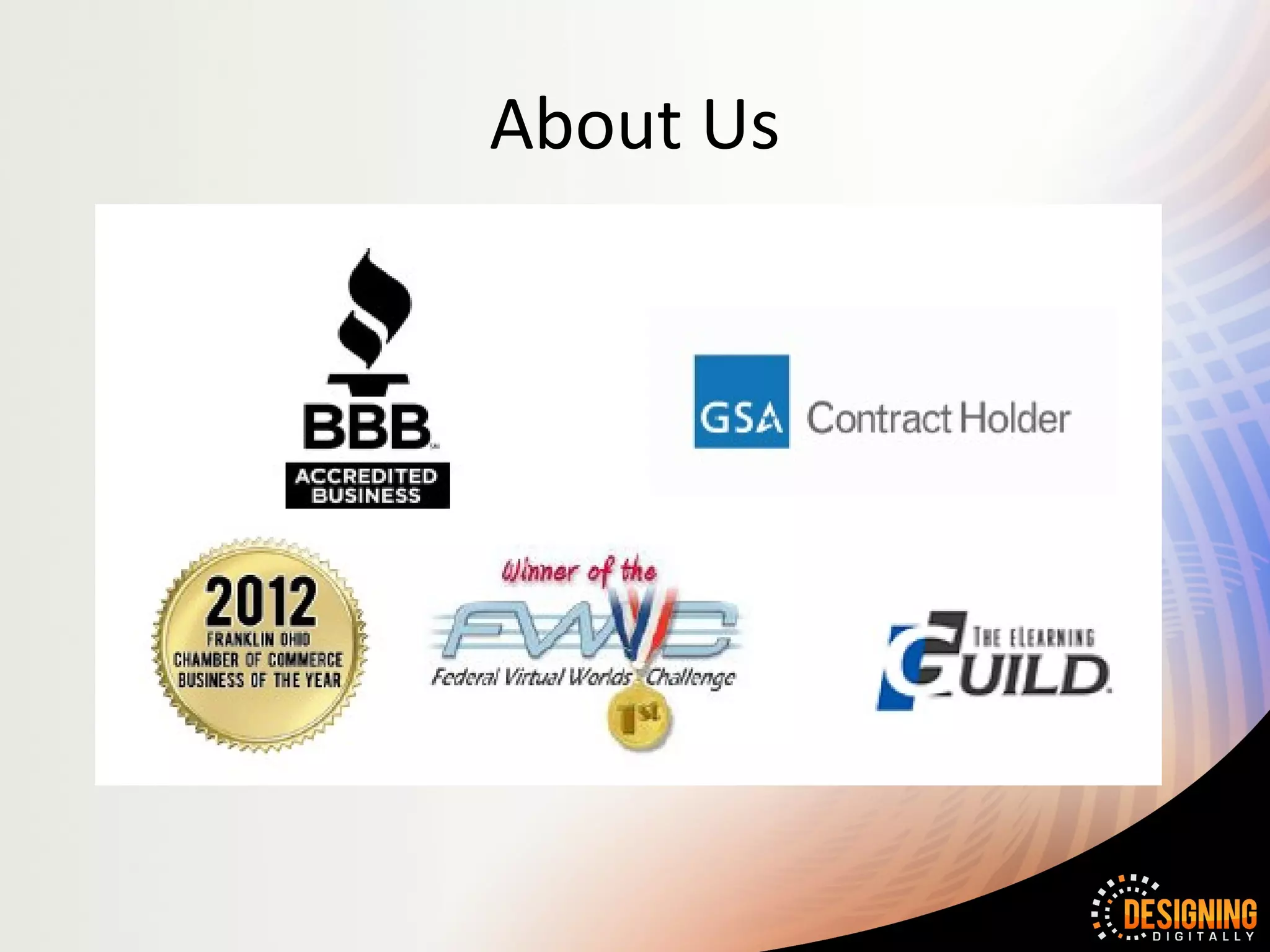 Designing Digitally, Inc. is an interactive media design firm established in 2001 that provides e-learning, training simulations, virtual worlds, and web development services. It has four major service departments and was incorporated in 2006. Some of its clients include government agencies and large corporations. It has created various online training tools and virtual worlds covering topics such as teaching, math, driver safety, and business orientation.