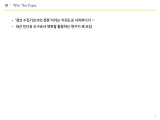 • 최근 인터뷰 도구로서 챗봇을 활용하는 연구가 꽤 보임