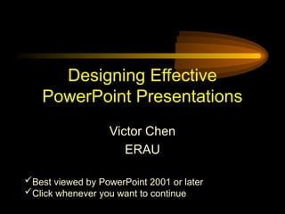 The document provides guidelines for designing effective PowerPoint presentations, emphasizing simplicity, clarity, and consistency in format and content. It outlines best practices such as using large, easily read fonts, limiting text, and avoiding distracting elements like excessive colors and animations. The overall goal is to enhance communication through clear visual support and focused design.