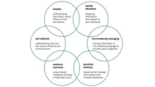 This document discusses effective science communication strategies for polarized audiences. It argues that simply providing more facts or claiming scientific consensus will not change attitudes that are shaped by cultural values. People process information through an identity-protective lens that aligns their views with their social groups. The document advocates for empathizing with different worldviews and framing messages in culturally affirming ways to avoid triggering resistance. It presents a case study showing that priming audiences with identity-affirming themes before scientific information can mitigate polarization. The key is designing communication that judges less and affirms diverse perspectives.