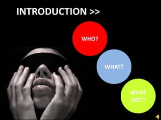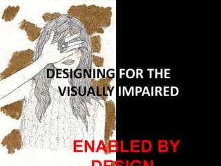 This document discusses designing assistive technologies for the visually impaired. It proposes a digital impression board and haptic pen that work together to allow users to feel textures and routes on a map. The digital board would use magnets to change textures under the pen tip, while the pen contains buttons, a microphone and vibration to provide feedback. It also suggests expanding these ideas to develop an assistive jacket with integrated GPS and texture detection to guide navigation without maps. The goal is to mirror human abilities and transfer tasks to natural actions through biomimicry and intuitive, memorable interfaces.