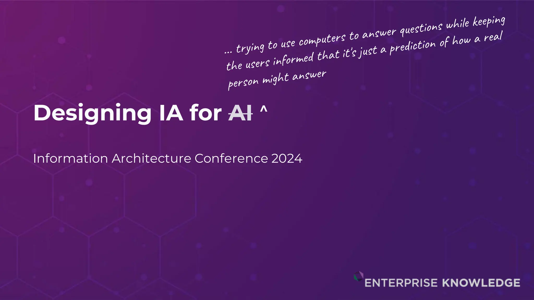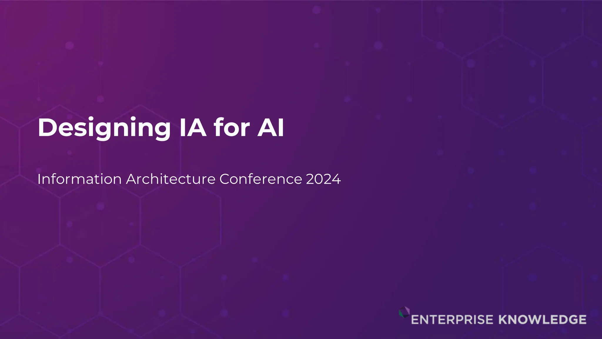 The document outlines the agenda and key topics for the 'Designing IA for AI' conference in 2024, focusing on how to prepare content and data for artificial intelligence applications. It discusses the importance of information architecture and enterprise knowledge, detailing strategies for leveraging AI to enhance knowledge management, including taxonomy design and data governance. The presenters, Chris Marino and Guillermo Galdamez, emphasize practical steps and best practices to improve organizational efficiency and user experience through AI integration.